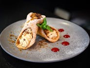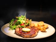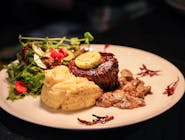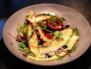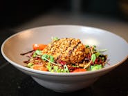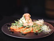 z mixem sałat, pomidorami, burratą, cebulą czerwoną, oliwą z oliwek i pieczywem szarpanym -