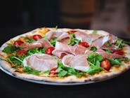 z sałatą rzymską, karmelizowaną czerwoną cebulą, parmezanem, pomidorami koktajlowymi, boczkiem, sosem cezar oraz grzankami